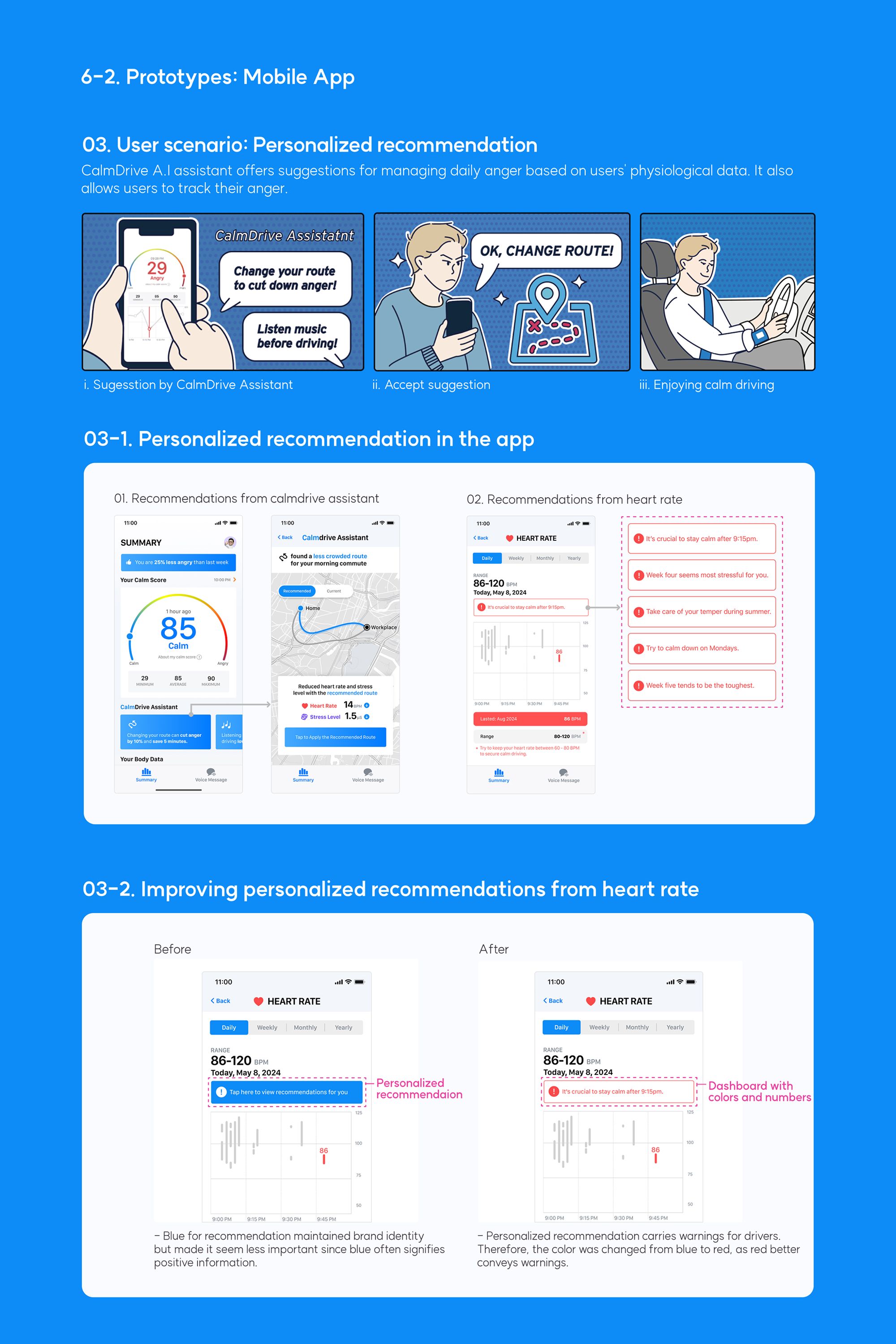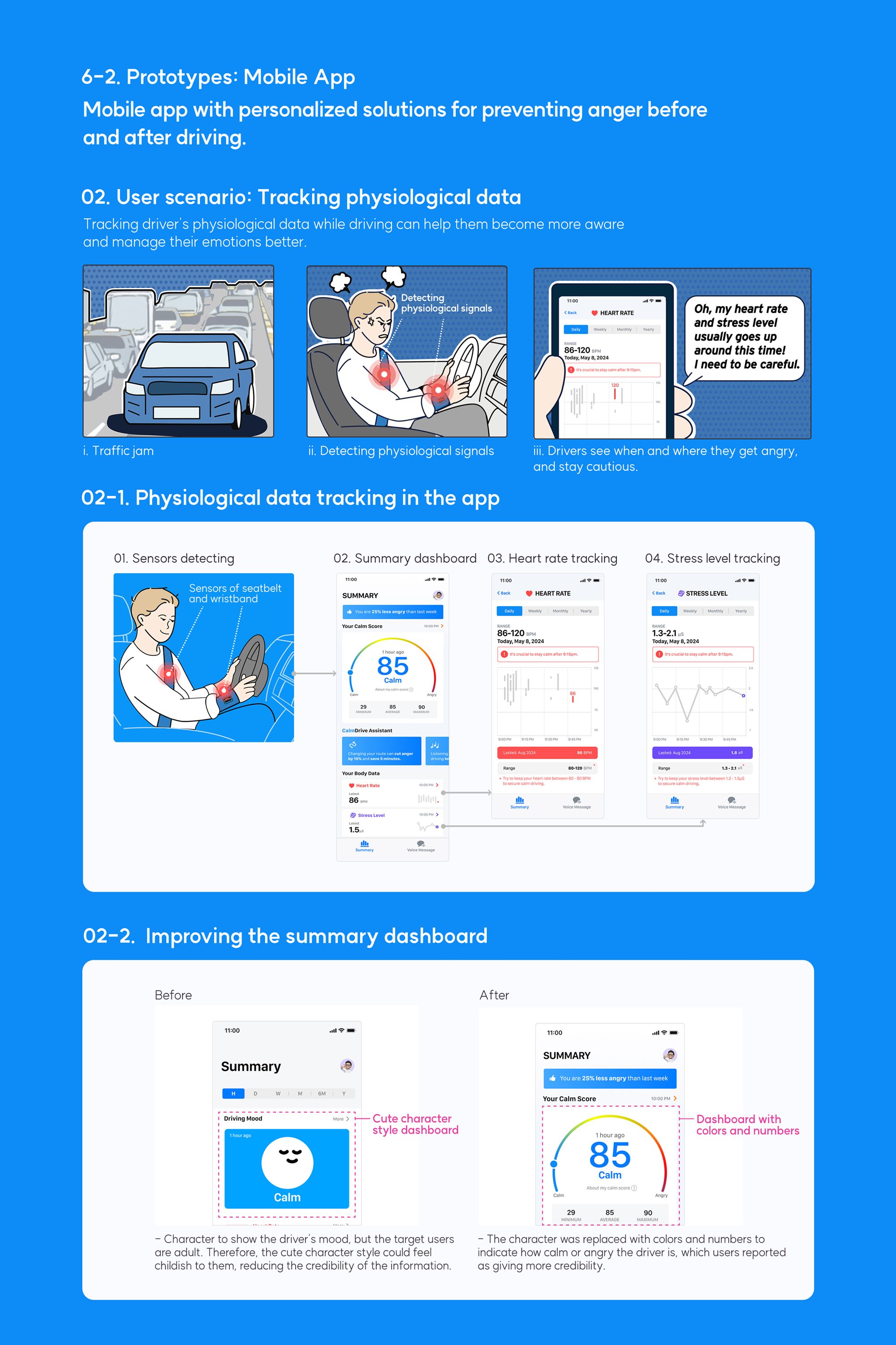 The key UX challenge was supporting a driver’s emotional regulation without adding distraction. Calmdrive detects early stress through sensors, but turning this biometric data into a safe and intuitive intervention required careful decisions about timing, feedback, and cognitive load. Another challenge was designing an interaction that felt genuinely calming. Research showed that generic audio was ineffective, so loved ones’ voices were used—a personal but sensitive element that needed to be delivered in a subtle, non-intrusive way. Finally, visualizing heart rate and stress data in the app required simplifying information and increasing credibility, which led to refined dashboards and clearer alerts.