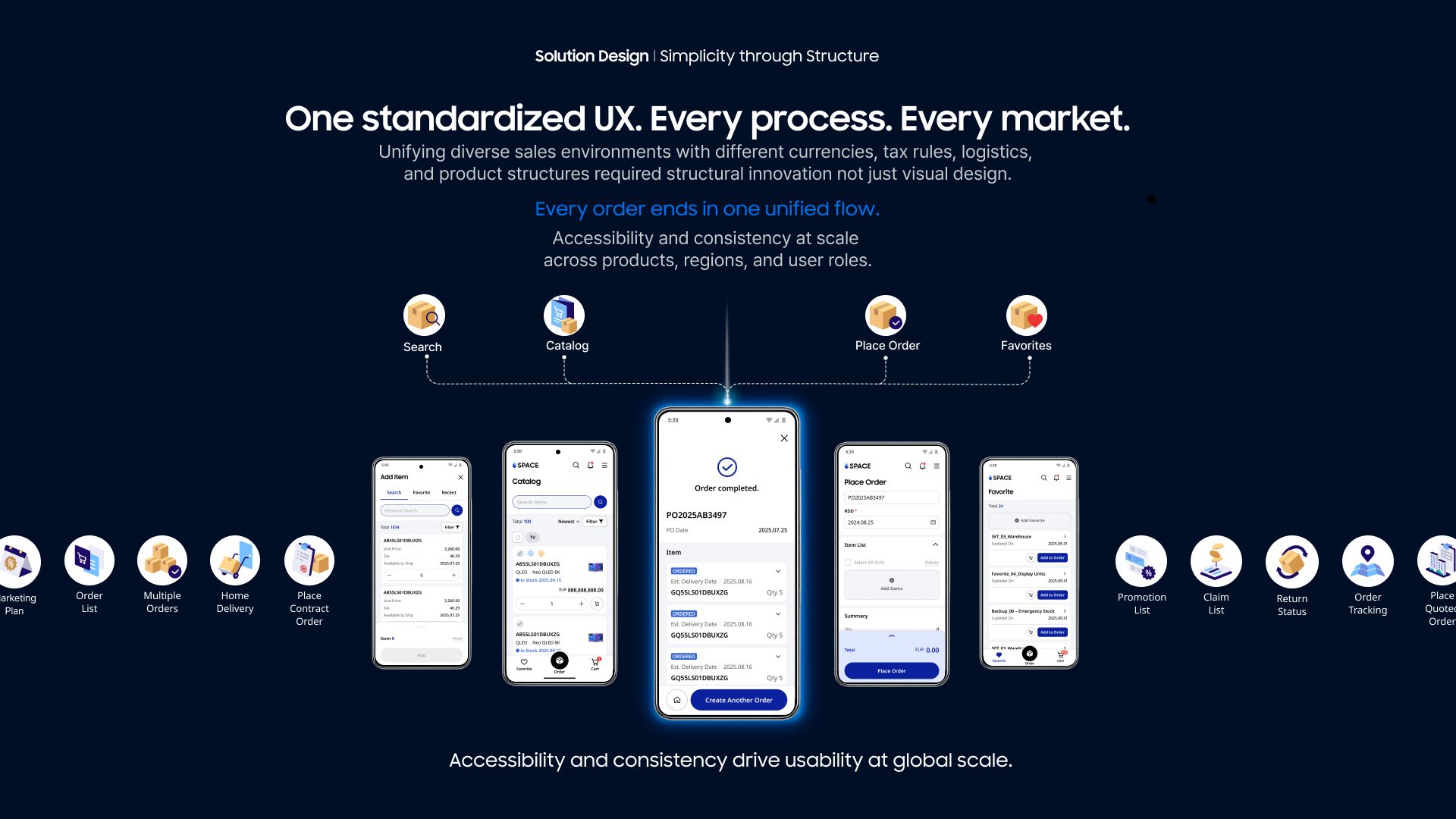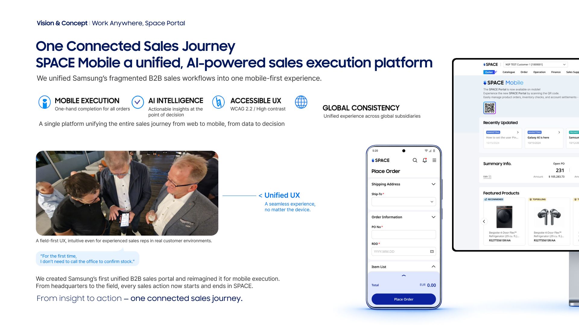The greatest UX challenge was unifying completely different sales environments into one simple mobile experience. We conducted extensive field research in Germany, the UK, and Vietnam—interviews, surveys, and real workflow observations—and discovered that each region followed different tax rules, pricing structures, logistics flows, and cultural expectations. Turning this complexity into a single, predictable UX flow required more than simplification; it required redefining the entire architecture of Samsung’s only global sales platform. The challenge was to create a mobile tool that adapts to every region automatically, yet feels seamless and intuitive for all users in high-pressure customer situations.