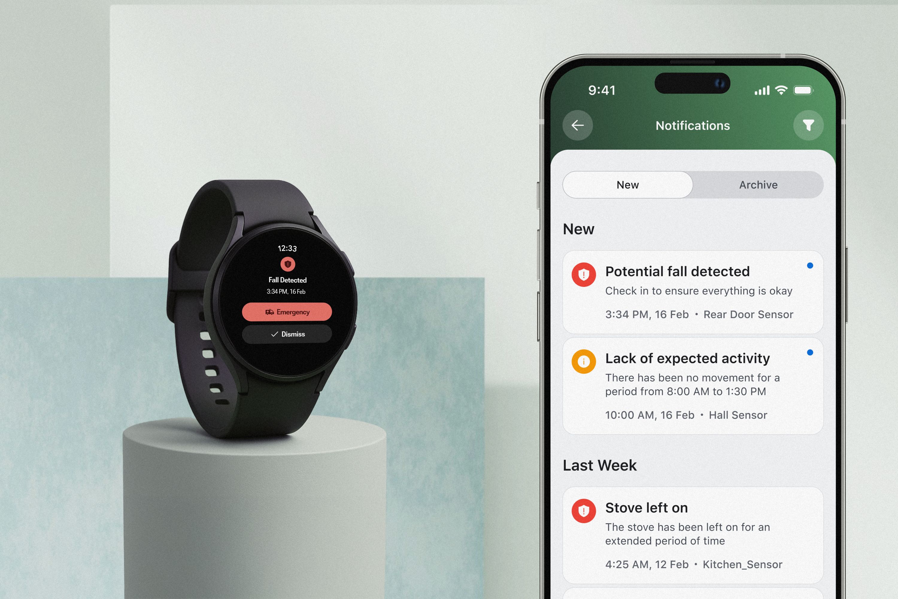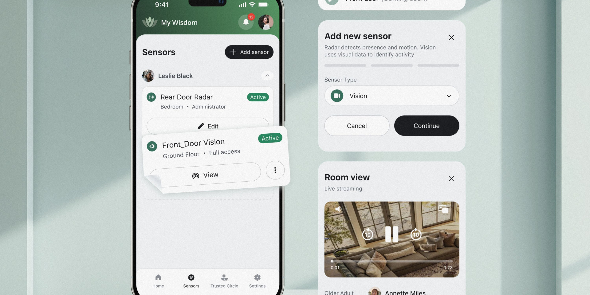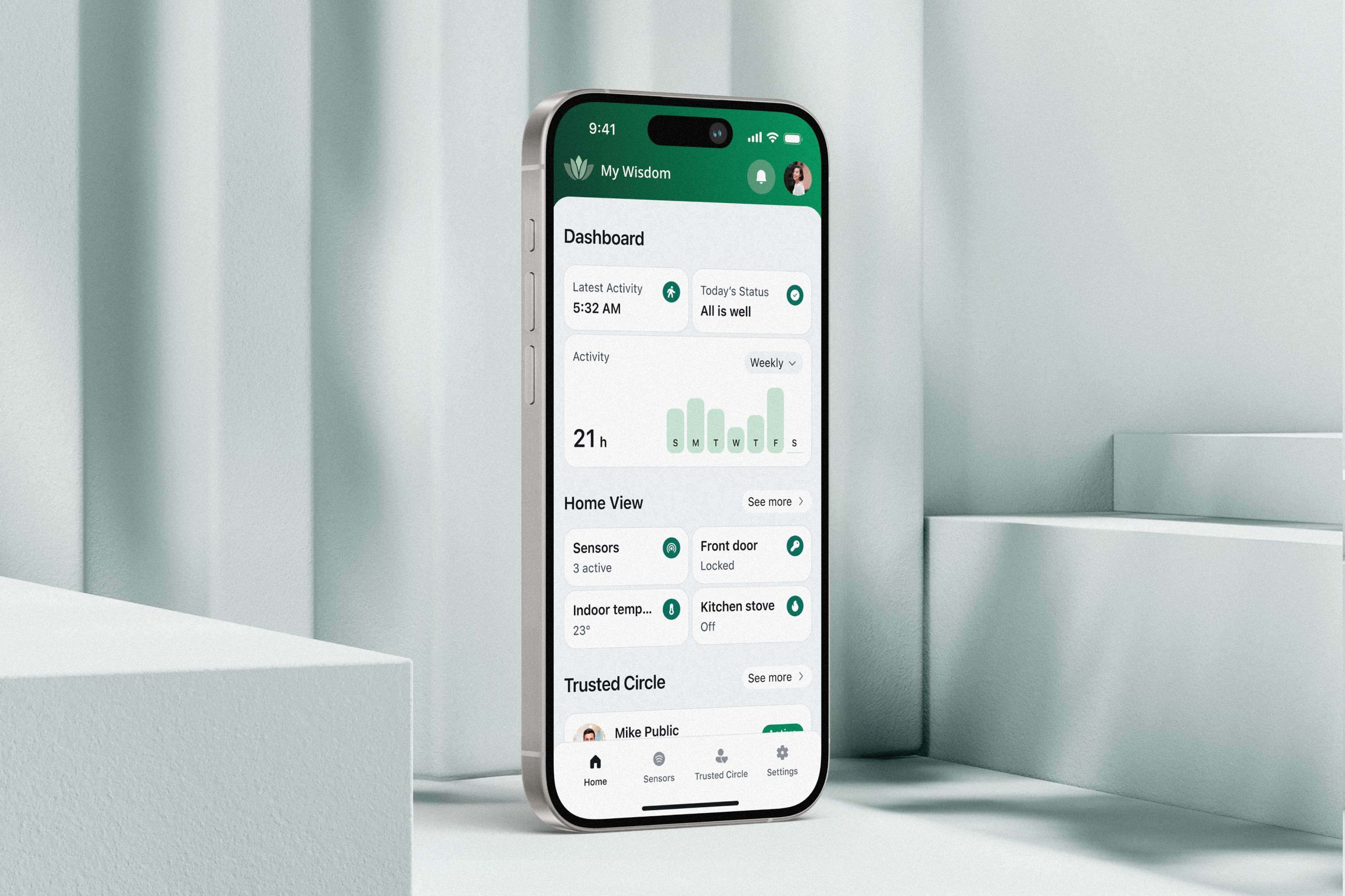 One of our biggest UX challenges was designing an experience that works equally well for older adults and for their Gen X caregivers. We needed an interface that feels calm, intuitive, and accessible, while still conveying meaningful insights about what’s happening in the home. Translating a complex, privacy-preserving smart-home system into a simple, trustworthy experience required careful choices to reduce cognitive load without losing important context.